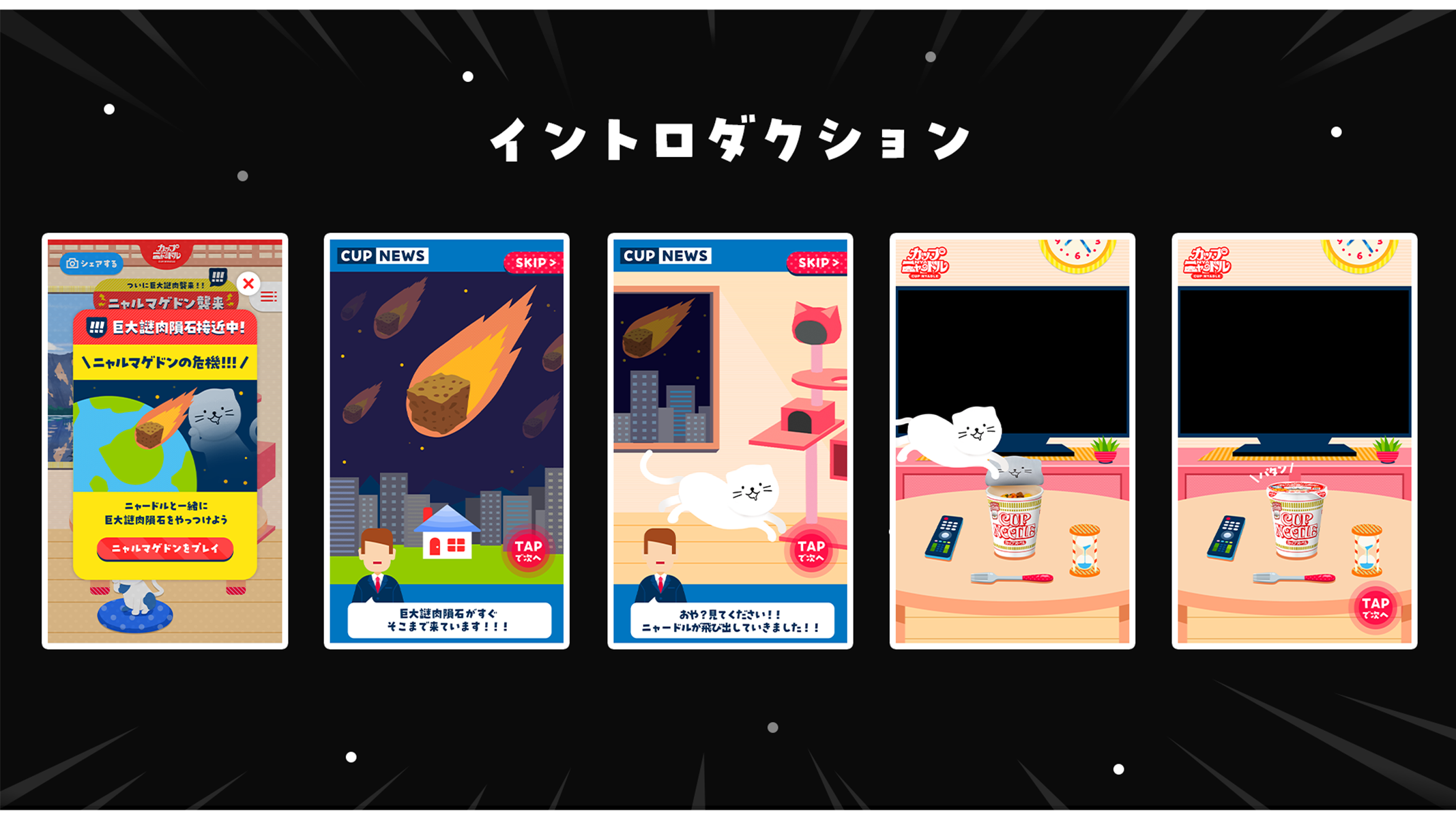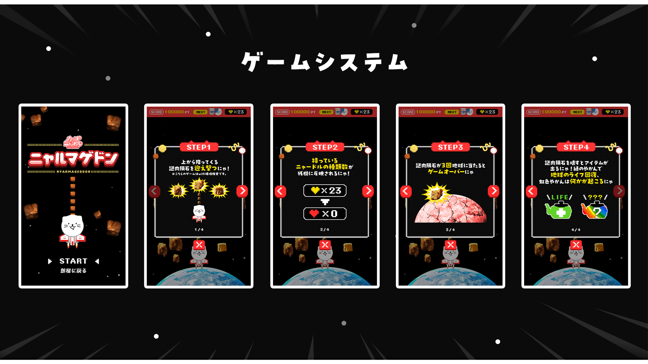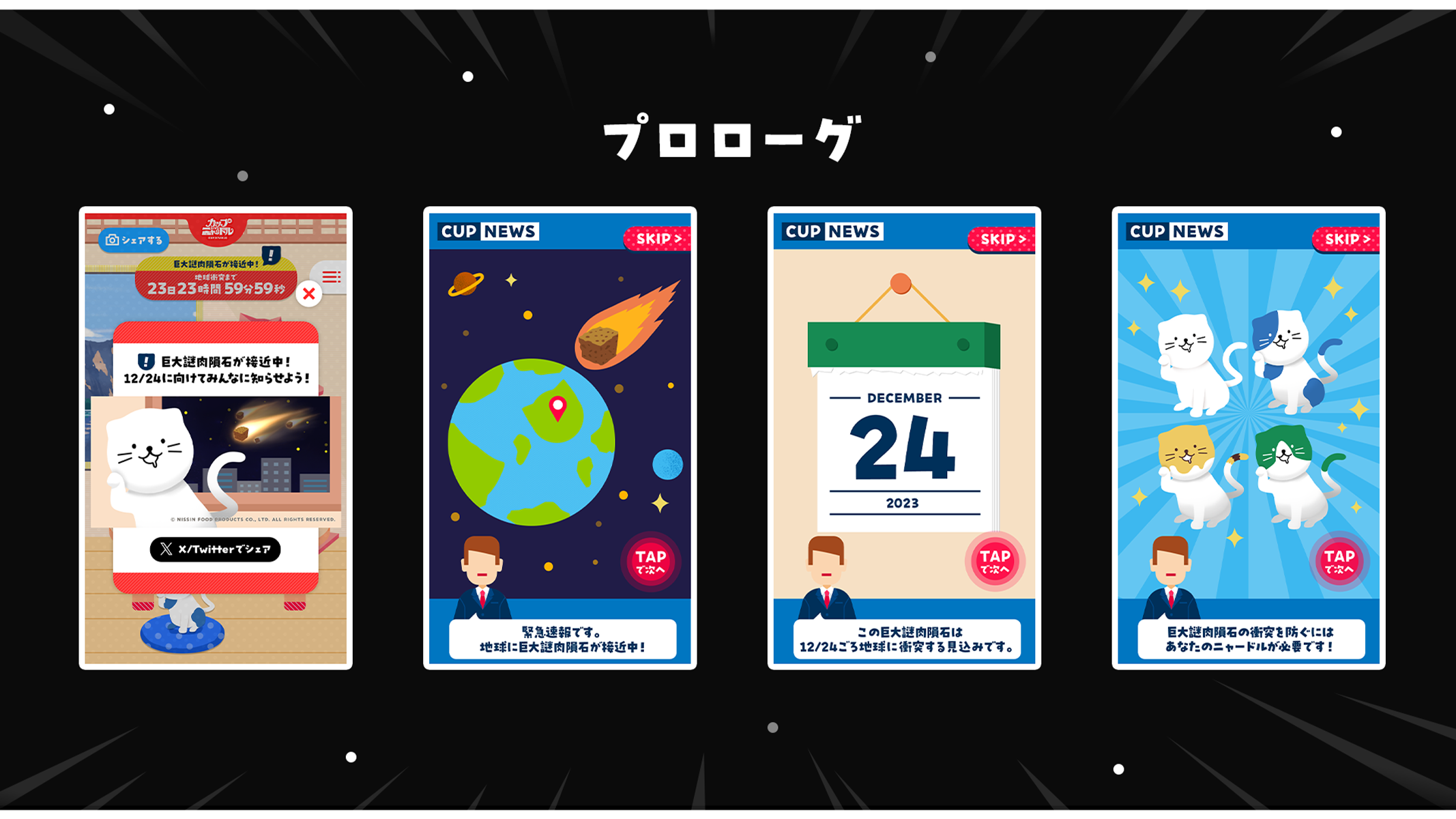 2023年9月よりリリースされた「カップニャードル」キャンペーンサイトのフィナーレとして、「巨大謎肉隕石」から世界を守るシューティングゲーム「ニャルマゲドン」キャンペーンサイトのテクニカルディレクションとデザイン、開発を行いました。
